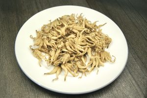 Fresh tubers are white to yellowish-white, fleshy, and divided into 4-6 finger-like segments, resembling a baby's hand. Wild tubers grown in the Nyingchi region of Tibet can reach up to 3 cm in diameter, with circular horizontal striations on the surface and a transparent, gelatinous texture when broken.